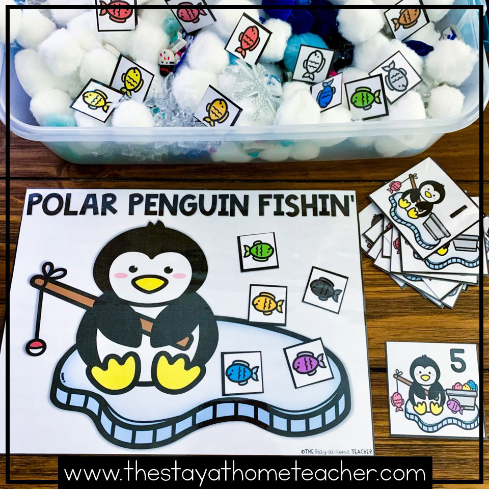 One of my favorite Polar Animals theme Math activities is the activity shown above! Who doesn’t love to go fishin’?! With this activity, children choose a penguin number card from their pile. They will identify the number the picked and use fish cutouts from the sensory bin to build the correct amount on the mat!