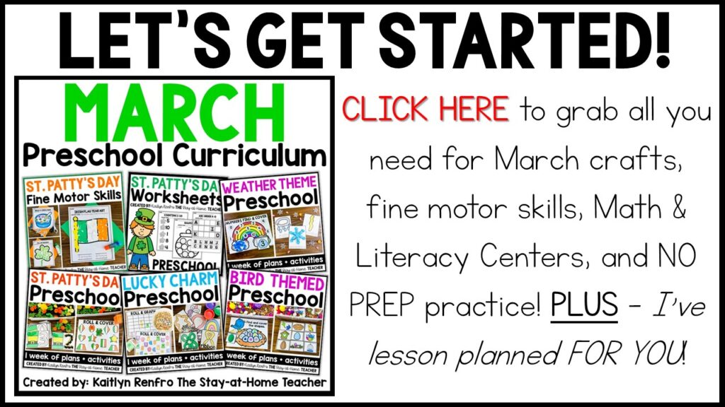 Ready to learn with your toddlers or Preschoolers ALL MONTH LONG?! You can save TONS when you grab this set of centers in our March Preschool Curriculum! The bundle includes 4 engaging March themes (like birds, weather, and more!), complete with a week of lesson plans for each! You’ll also get 25 NO PREP St. Patrick’s Day themed fine motor skills worksheets and crafts, and 38 NO PREP Math and Literacy worksheets for extended practice!