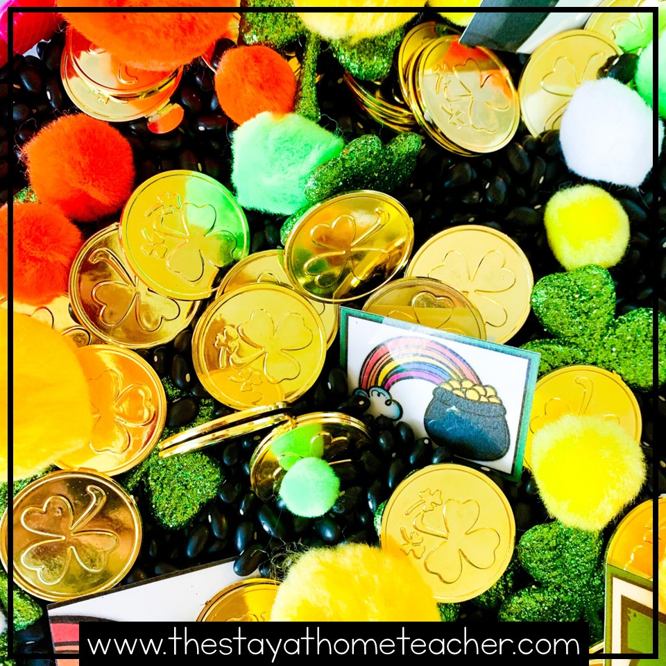 NEXT, grab some extra St. Patrick’s Day themed items like plastic gold coins, glittery clovers, rainbow colored pompoms, etc. These items make the perfect backdrop for the printable items in our preschool Good Luck Charm activities! Scatter them throughout your sensory bin filler and watch the theme really come to life!