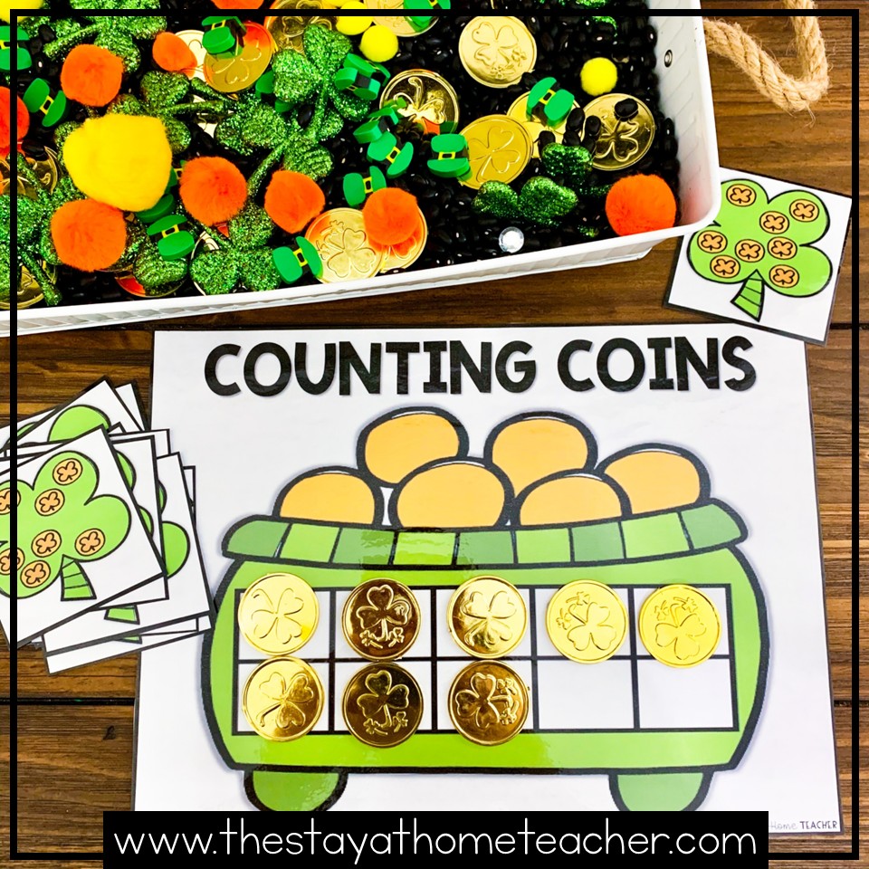 One of my favorite St. Patrick’s Day theme Math activities is the activity shown above! Count and build activities are a fun way to turn counting practice into a game. To use this activity, children choose a clover card from their stack and count the number of coins. Using manipulatives from the sensory bin, children build the matching number of coins on their 10 Frame.