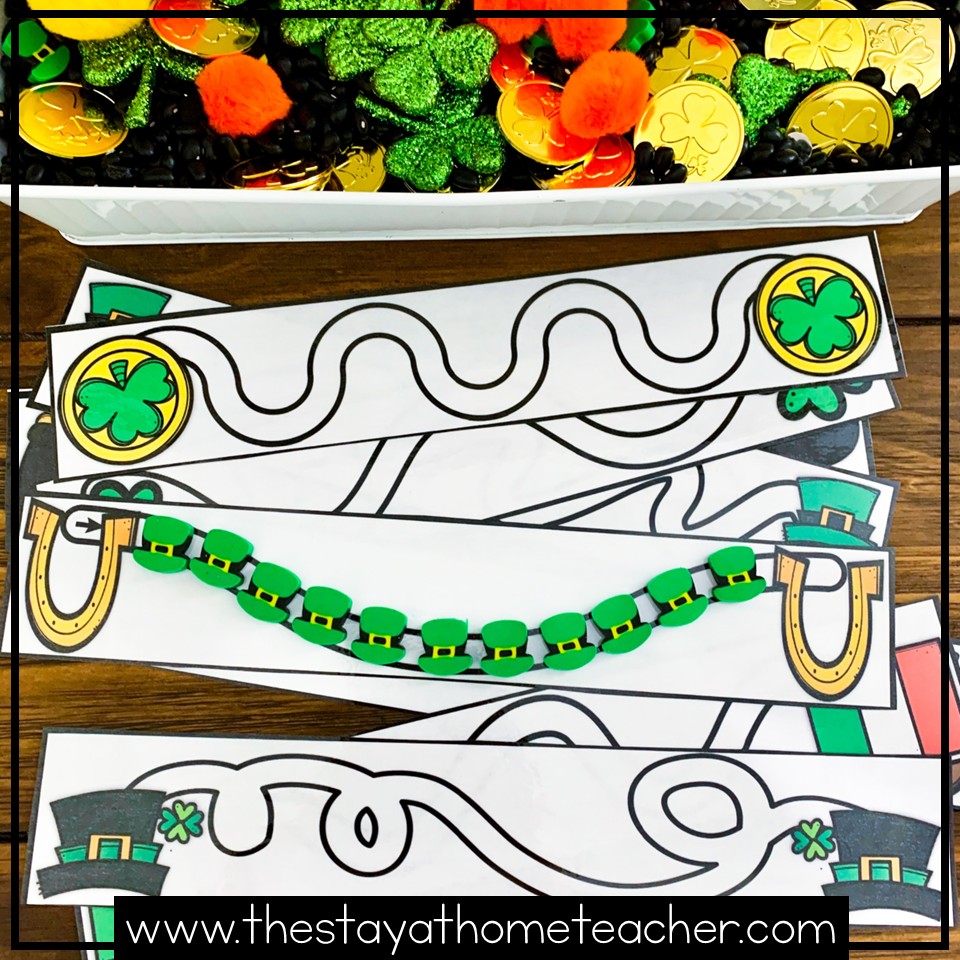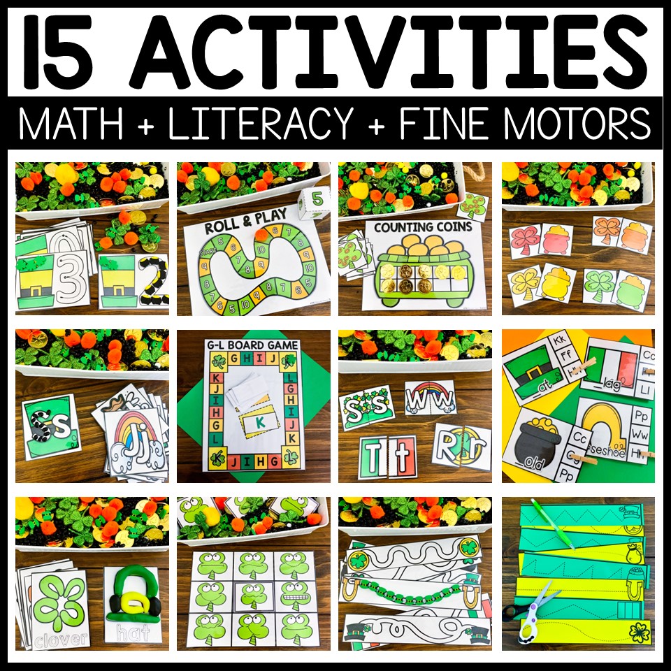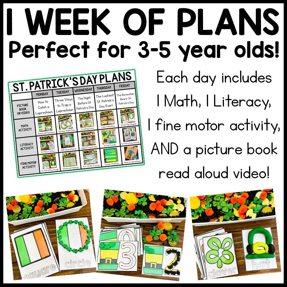 This St. Patrick’s Day Preschool theme is sure to give your little learners TONS of fun practice! Children will have 15 center-style activities to choose from – 5 Math, 5 Literacy and 5 Fine Motor centers. In addition, I’ve included book recommendations for 5 St. Patrick’s Day theme picture books and links to their read aloud videos on YouTube!