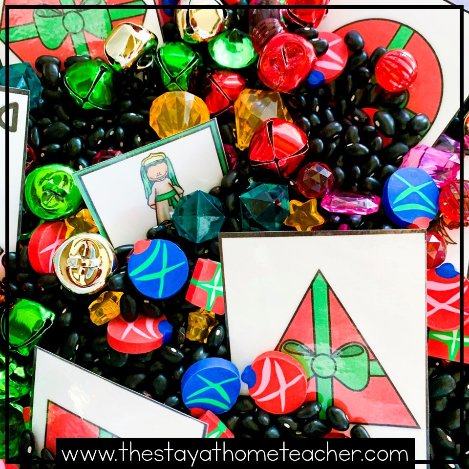 NEXT, grab some extra Christmas themed items like plastic trees and ornaments, little gingerbread men, gumdrop puffy stickers, colorful pompoms, etc. These items make the perfect backdrop for the printable items in our preschool Christmas pack! Scatter them throughout your sensory bin filler and watch the theme really come to life!
