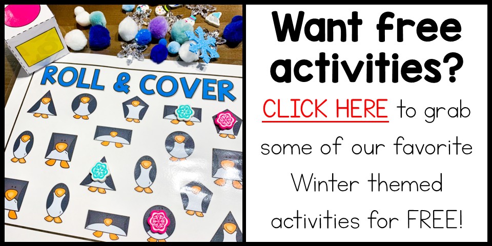 Can you tell we love Roll & Cover activities? They truly turn school work in a game, which is perfect for engaging little learners! To play this Free Winter activity, students roll the shape dice and cover a penguin shape to match. Continue rolling and covering until all of the snowballs are covered!