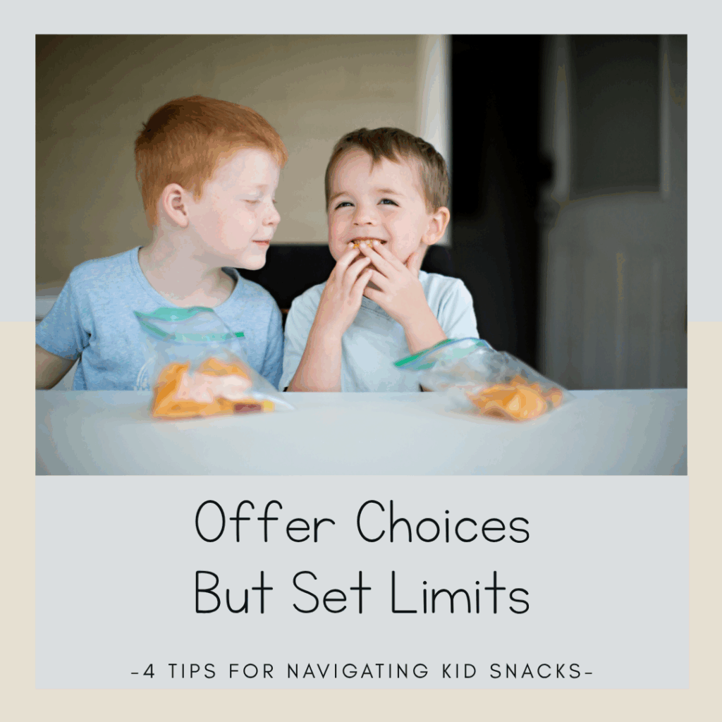 Toddlers and early elementary kiddos thrive when they feel a sense of independence. Instead of opening the pantry floodgates, try offering two or three options during snack time. You stay in charge, but they get to make a decision—win, win!