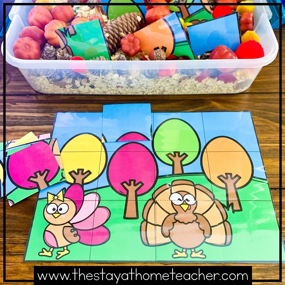 The other 3 activities in our Thanksgiving toddler bins are our puzzle bins. We LOVE puzzles! But sometimes starting out with a jigsaw puzzle is a little too abstract for little learners. So these activities take the same concept of the matching mats and give children a helpful visual for completing their puzzles.