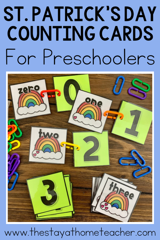 Be sure you keep those links out from the counting game so you can exercise fine motor skills with our free St. Patrick’s Day color sorting cards! Now if your kiddos are tiny and still working on grasping the links, that’s okay! Lay these cards flat in your learning area and help them choose small items from their room, toys, sensory bin, etc. to sort onto the cards by colors. But if you’re reading for some extra fine motor skills practice, grab those links and start linking! I like to punch a hole in the bottom of the card and watch my kiddo make “clover kites” using the correct colors on the cards!
