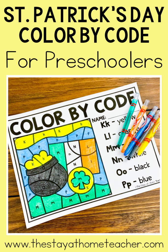 Color by code activities are so much fun, and this free St. Patrick’s Day page is no exception! To use, children practice locating letters K-P on their worksheet and color them by the provided code. I love watching my little one finally recognize what the mystery picture is as she works! Color by code printables are especially helpful activities for children who are focusing more on letter identification rather than letter formation. If writing and tracing letters are still a little frustrating for your little learners, color by code sheets are a great way to keep them excited about their practice!